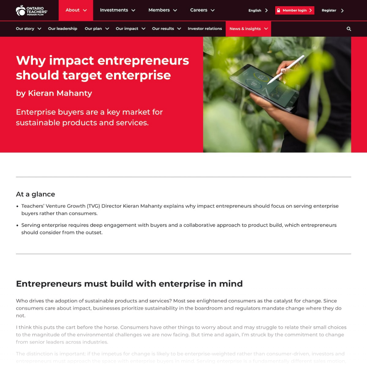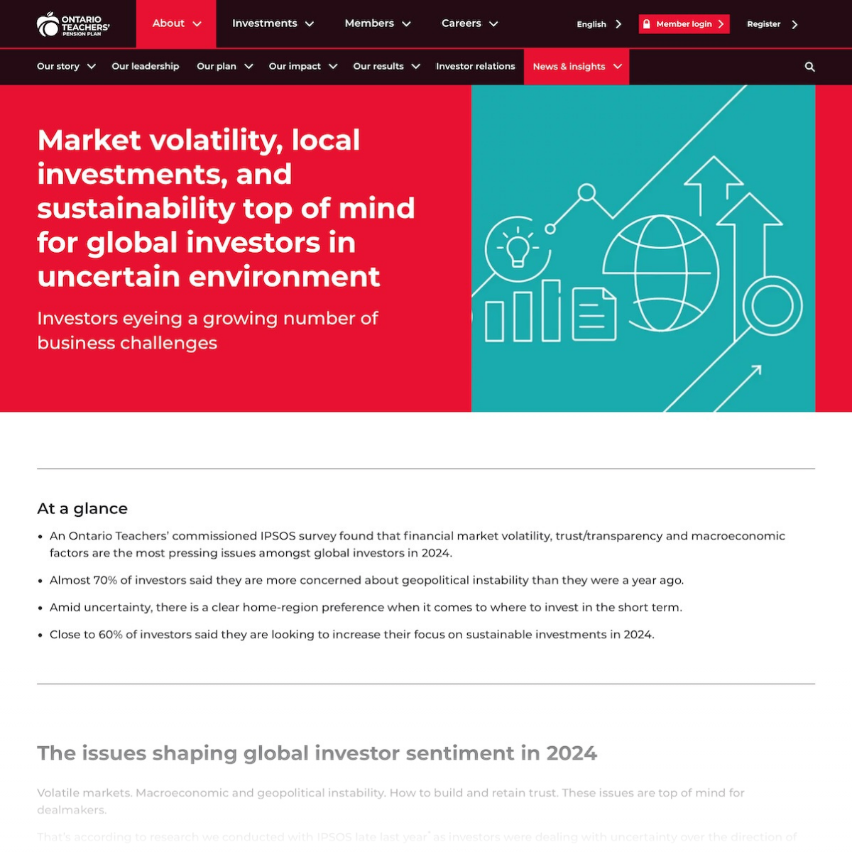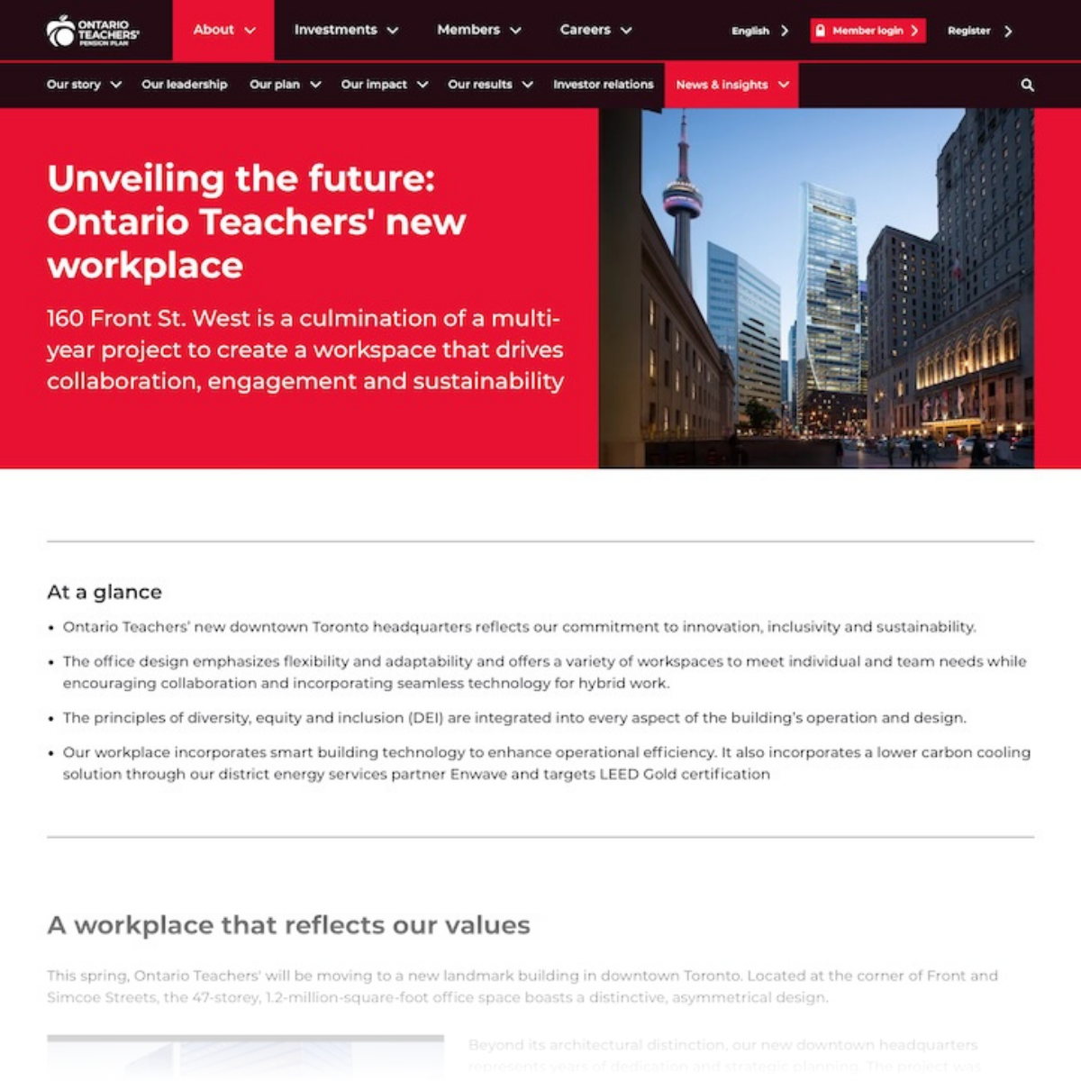 Beyond social media, I played a key role in developing thought leadership and insights content for OTPP.com. These long-form articles and research pieces were designed to establish OTPP’s expertise, support our brand positioning, and provide valuable insights to our B2B audience of institutional investors and pension industry peers. Below is a selection of my favourite, high-performing pieces.
